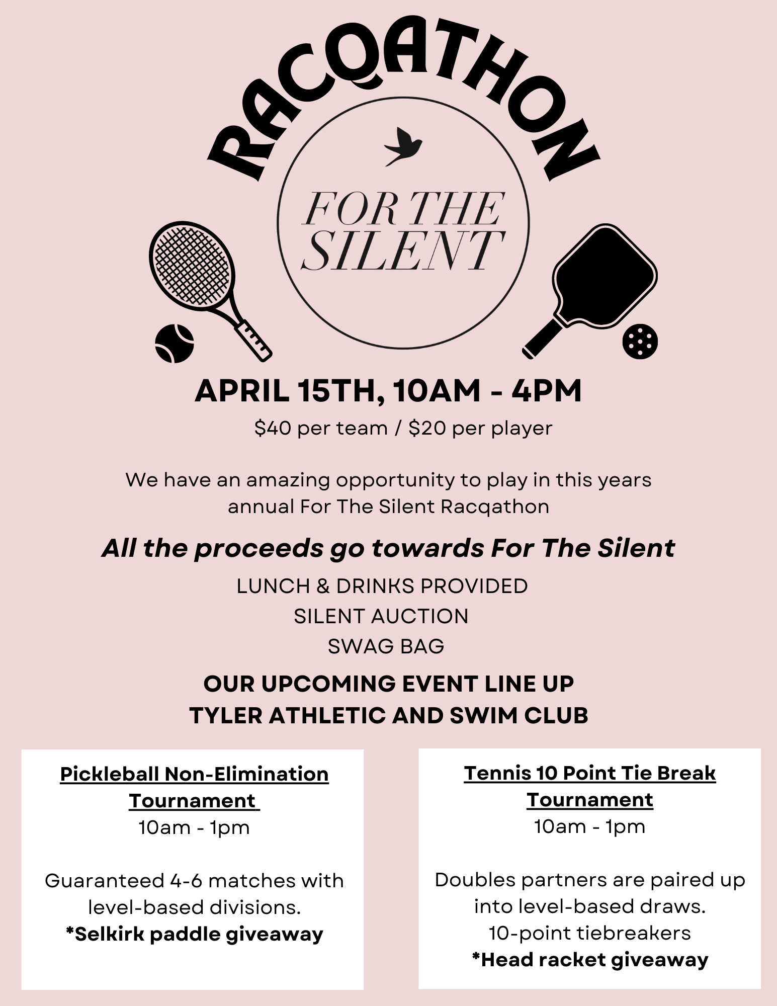We would like to extend a HUGE THANK YOU to Tyler Athletic & Swim Club for hosting For The Silent’s Family Field Day & Racqathon at their State-of-the-Art facility! Click here to become a Tyler Athletic & Swim Club member or to schedule a tour of their club today!